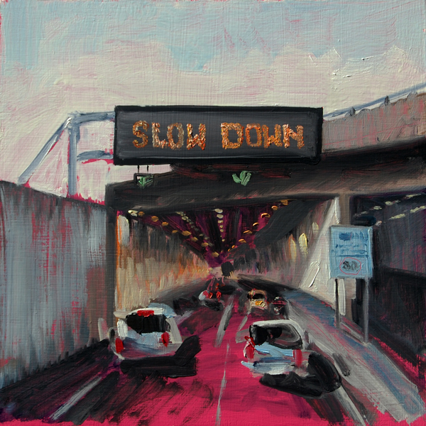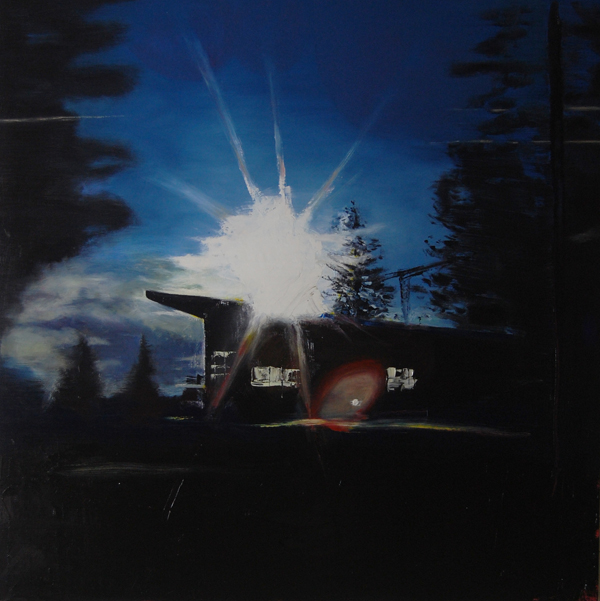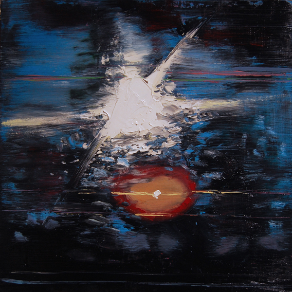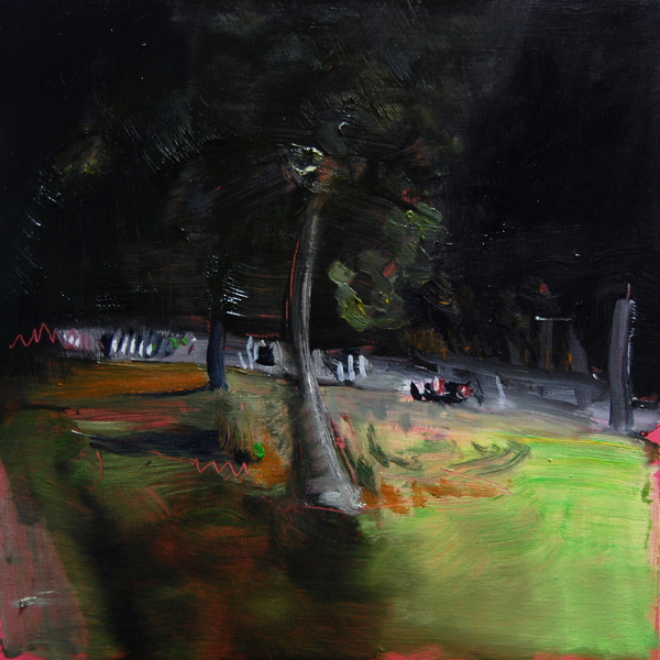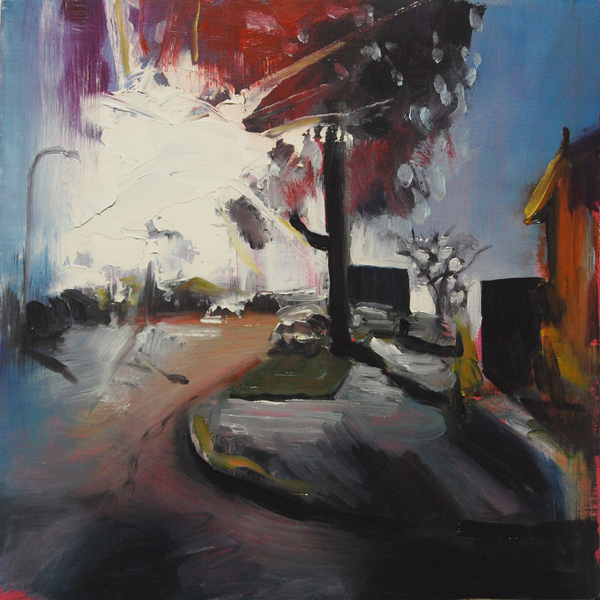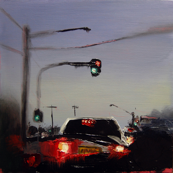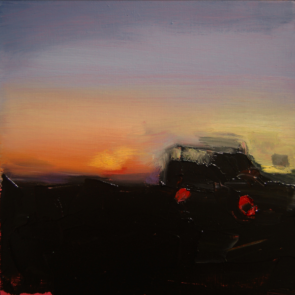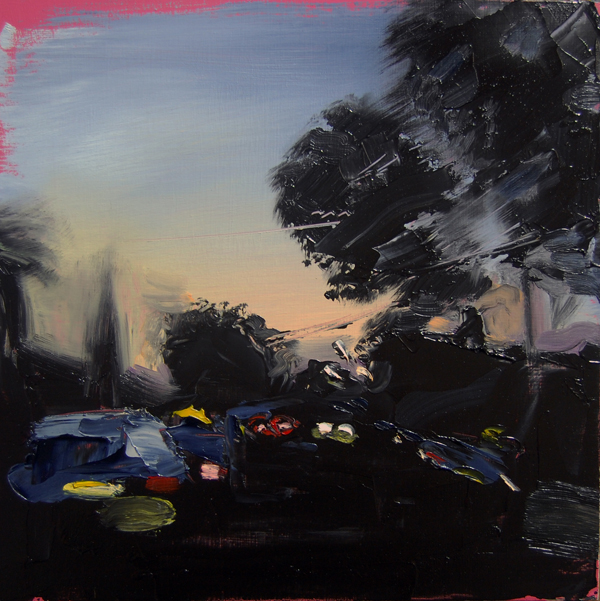 Sydney-based Collins’ works are responses to sensation and visual experience. For the most part they are “small slices of everyday life” seen through the windscreen of a moving vehicle as he drives homeward in the city’s traffic. At that ‘edge’, between day and night, form recedes into silhouette or is briefly illuminated in the harsh, artificial glare of headlights. His son’s regular soccer training on the shores of the Bay provides Collins an opportunity to do a bit of exercise himself and to be immersed in the surrounding landscape. Several paintings depict the scenes unfolding as he cycles or jogs in the cool night air and evening’s shifting shadows.